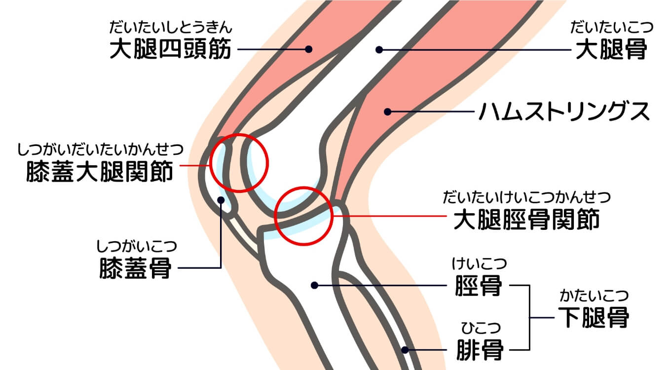 膝関節の構造を詳しく説明すると、大きな関節が2つ存在しています。1つは「大腿脛骨関節」、もう1つは「膝蓋大腿関節」です。「大腿脛骨関節」は大腿骨と脛骨の間に存在し、膝で体重を支える際に最も負担がかかる、重要な役目のある関節です。「膝蓋大腿関節」は大腿骨と膝蓋骨の間に存在し、膝蓋骨が膝を曲げたり伸ばしたりする際に、大腿骨の上を上下に滑るように移動します。通常はあまり負担がかからない関節ではありますが、強く膝を曲げる際に大きな負担がかかる関節です。