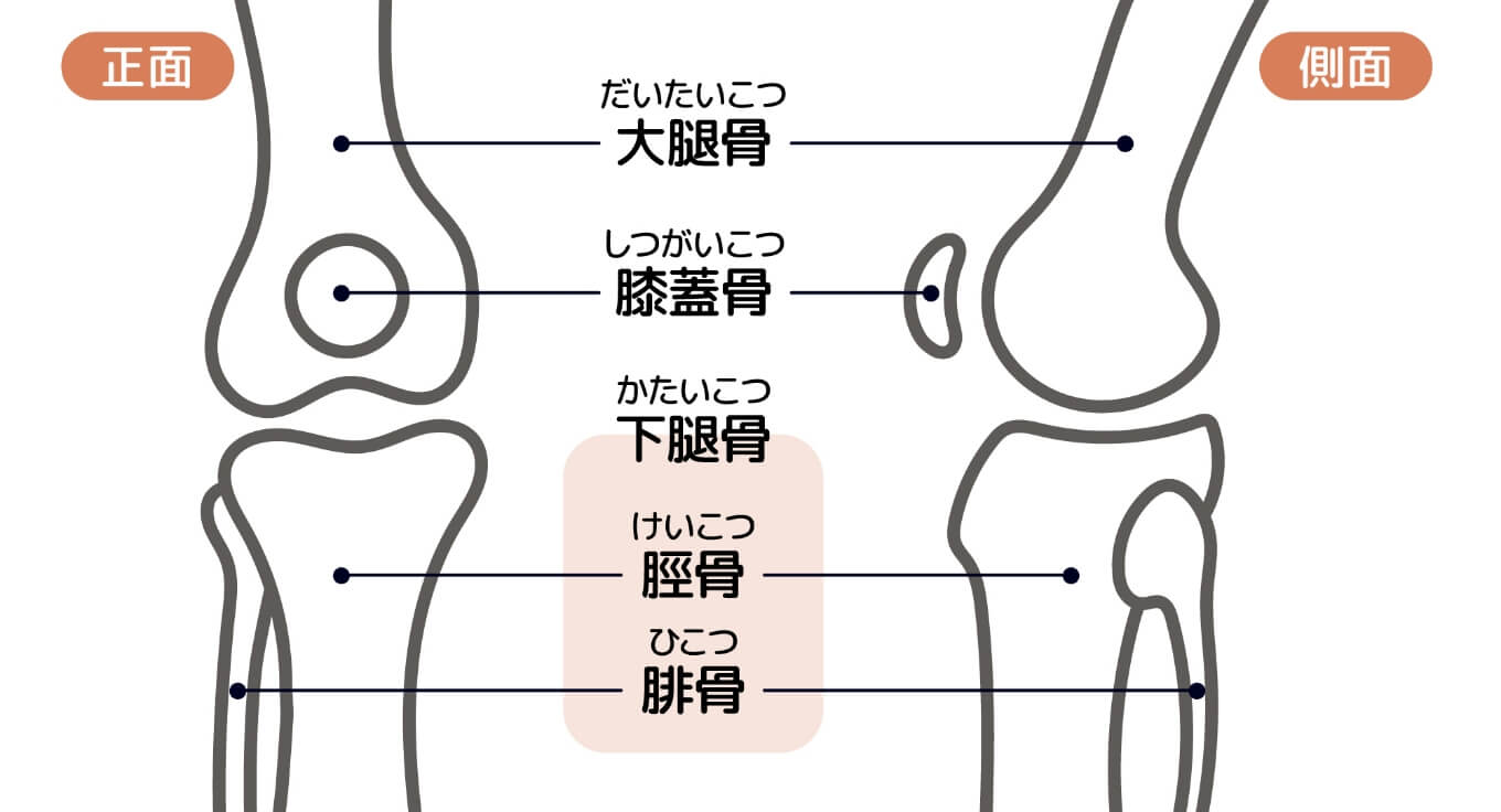 下腿骨は膝関節の下部に当たる骨で、2つの骨で構成されています。1つは脛骨、もう1つは腓骨です。この中で膝関節に触れるのが脛骨で、膝より上の体重を支える大きな役割を担います。