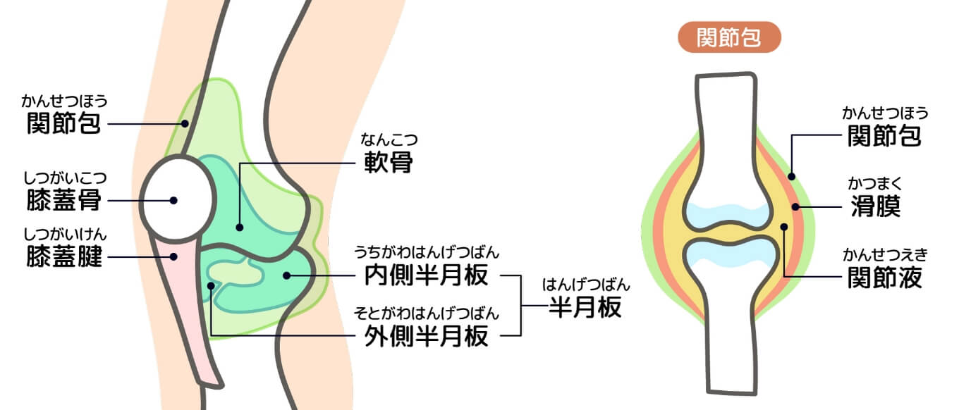 そのため、膝関節は膝を安定させることはもちろんのこと、膝にかかる衝撃や摩擦を少しでも軽減させるための保護機能的なものが存在します。